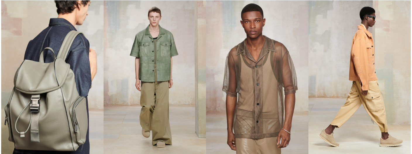 機能性と遊び心のあるデザインが特徴で、着用者に快適さと自信を持たせることを目的としたメンズコレクションでは、現代的なメンズウェアの主要アイテムでもあるカーゴパンツ、キャンプカラーシャツ、パーカ、バイカーなどを再構築し、クリエイティブなサプライズ要素を落とし込みました。それは、シルエットを強調する加工が施されたフルレングスのパンツや、カモフラージュ、オリーブレザー、シアーメッシュのカッティング、またワークウェアのポケットが施されたキャンプカラーのシャツによって表現されています。リブカフスのレザートラックパンツとリバースプリーツのカーキポプリンパンツは、セミカジュアルでありながらラグジュアリーな風合いを持ち合わせます。地形柄のシャツは、SRPLSによる新しいスタイリングの領域を開拓すべく最先端なアイテムとして提案しています。