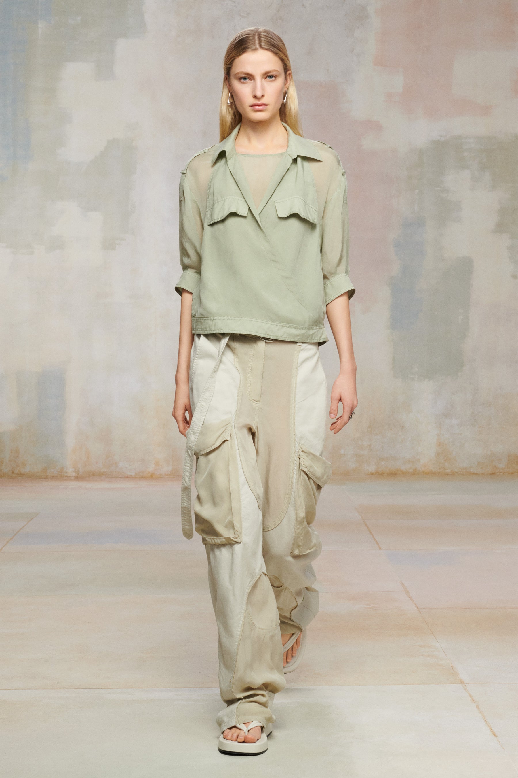 「心地よさ」をキーワードに展開するウィメンズコレクションでは、ソフトショルダーのドレスやテーラリング、現代のさまざまなシーンで活躍する魅力的で実用的なシューズやアクセサリーが登場します。淡いテラコッタ、スレートグレー、オフホワイトなどのニュートラルなカラーパレットに加え、意外性のあるピーチやペトロールブルーがコレクション全体を彩り、パリッとしたポプリン地やマットなテンセル地、滑らかなシルクビスコースのパッチワークが一際目を引くテクスチャーの相互作用を生み出します。Dリングファスナーやエポレットのディテール、カーゴショーツにはSRPLSの実用主義的な哲学の要素が落とし込まれ、プリーツ加工のラップドレスやアシンメトリーな裾のスモックドレスに施されたドローストリングがギャザーの調整を可能にし、デザインの変貌を楽しむことができます。