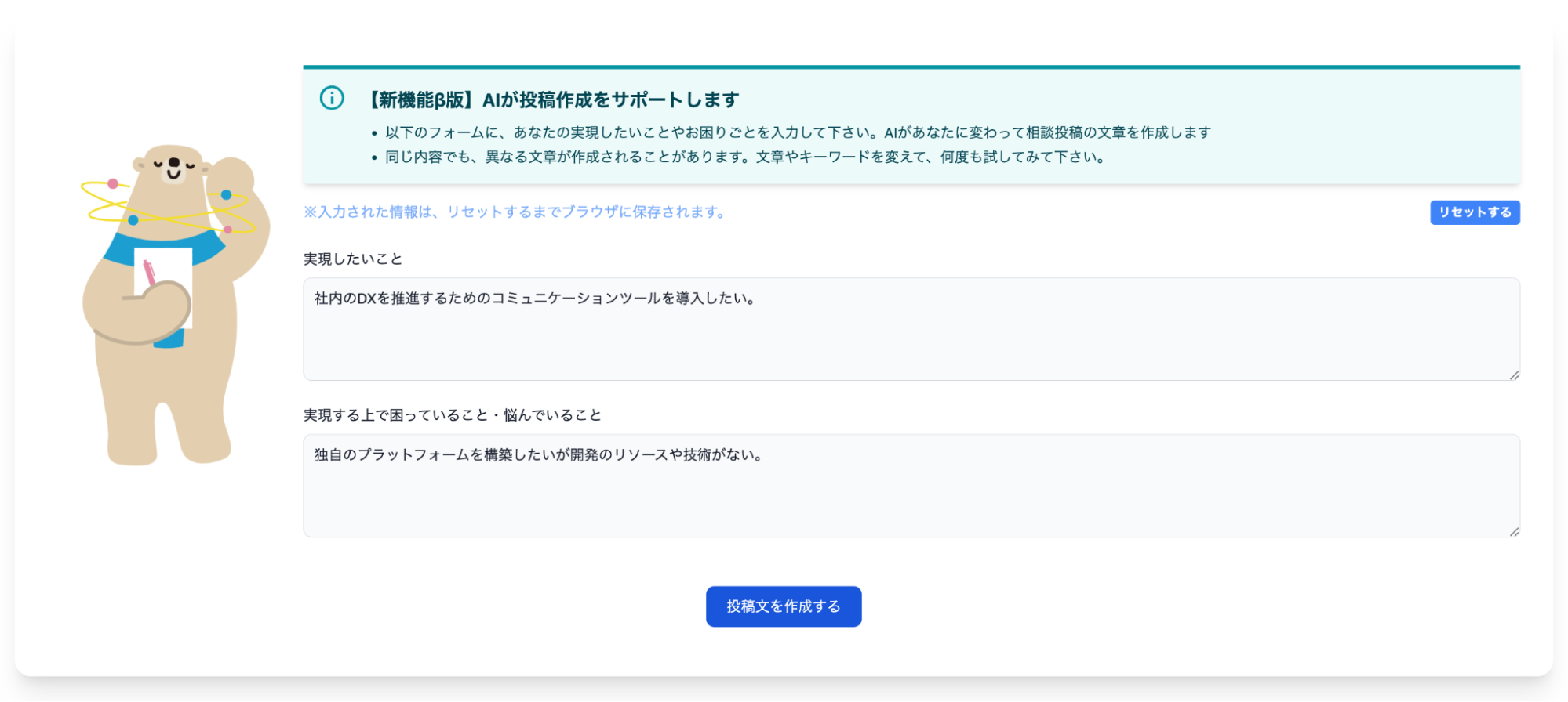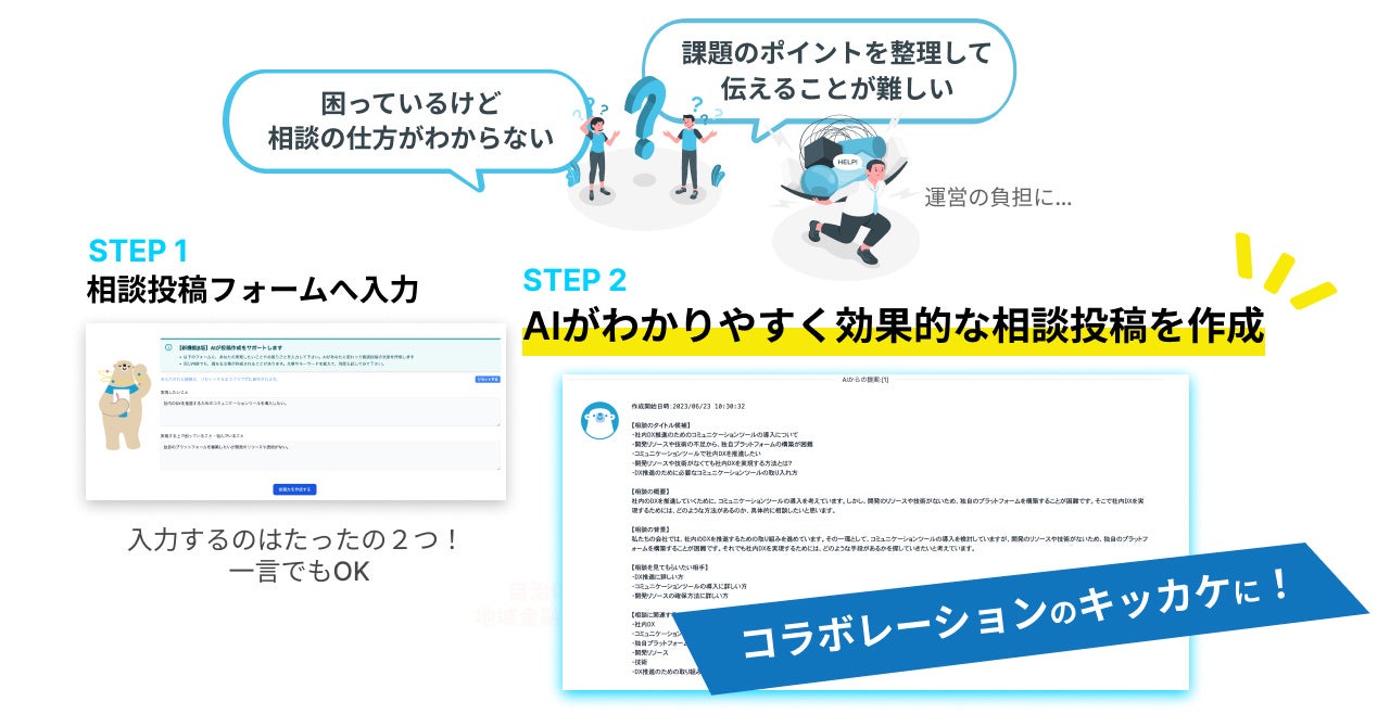 OpenAIのChatGPT APIを活用したビジネス課題の言語化と伝わるポイントを押さえた文章作成補助によって、アイデアやソリューションが集まりやすくなる相談投稿の作成をサポートします。
