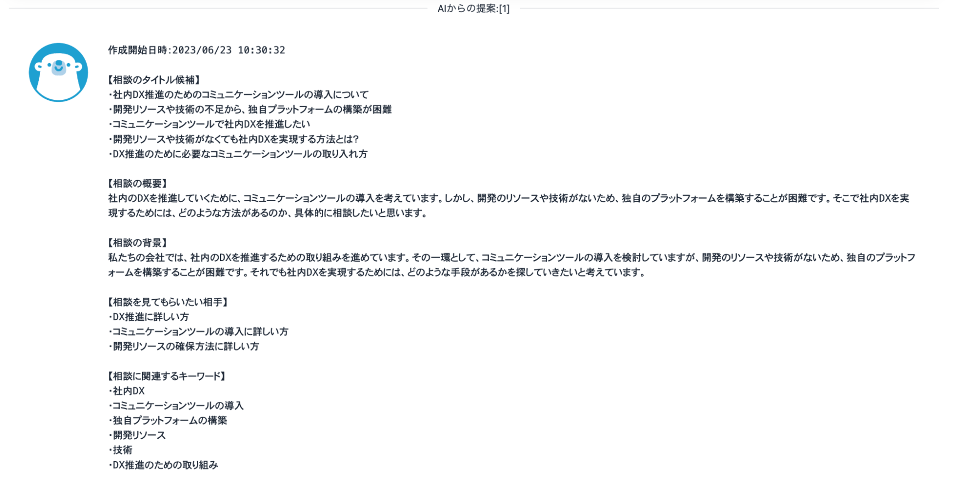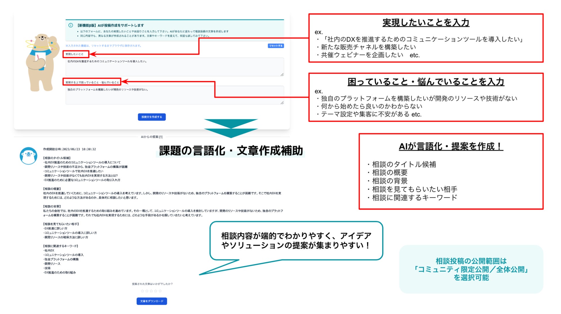 これまで、コミュニティを運営するオーナーが、参加者のビジネス課題の言語化や文章作成といった相談投稿支援を行うことでコミュニティの活性化を図っていましたが、オーナーの方々の負担削減と効果的なコミュニティを運営をより支援したいと考え、今回のリリースに至りました。