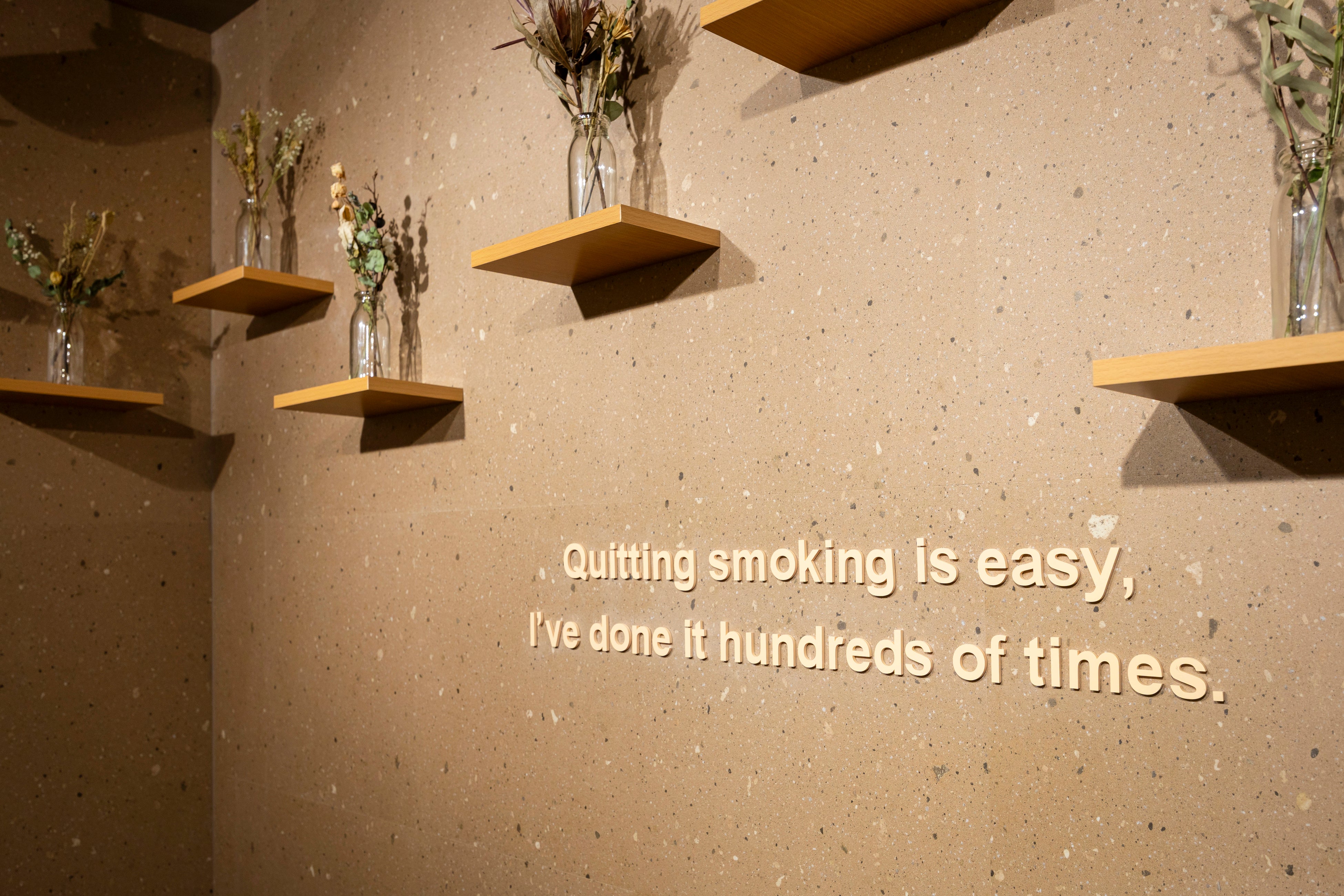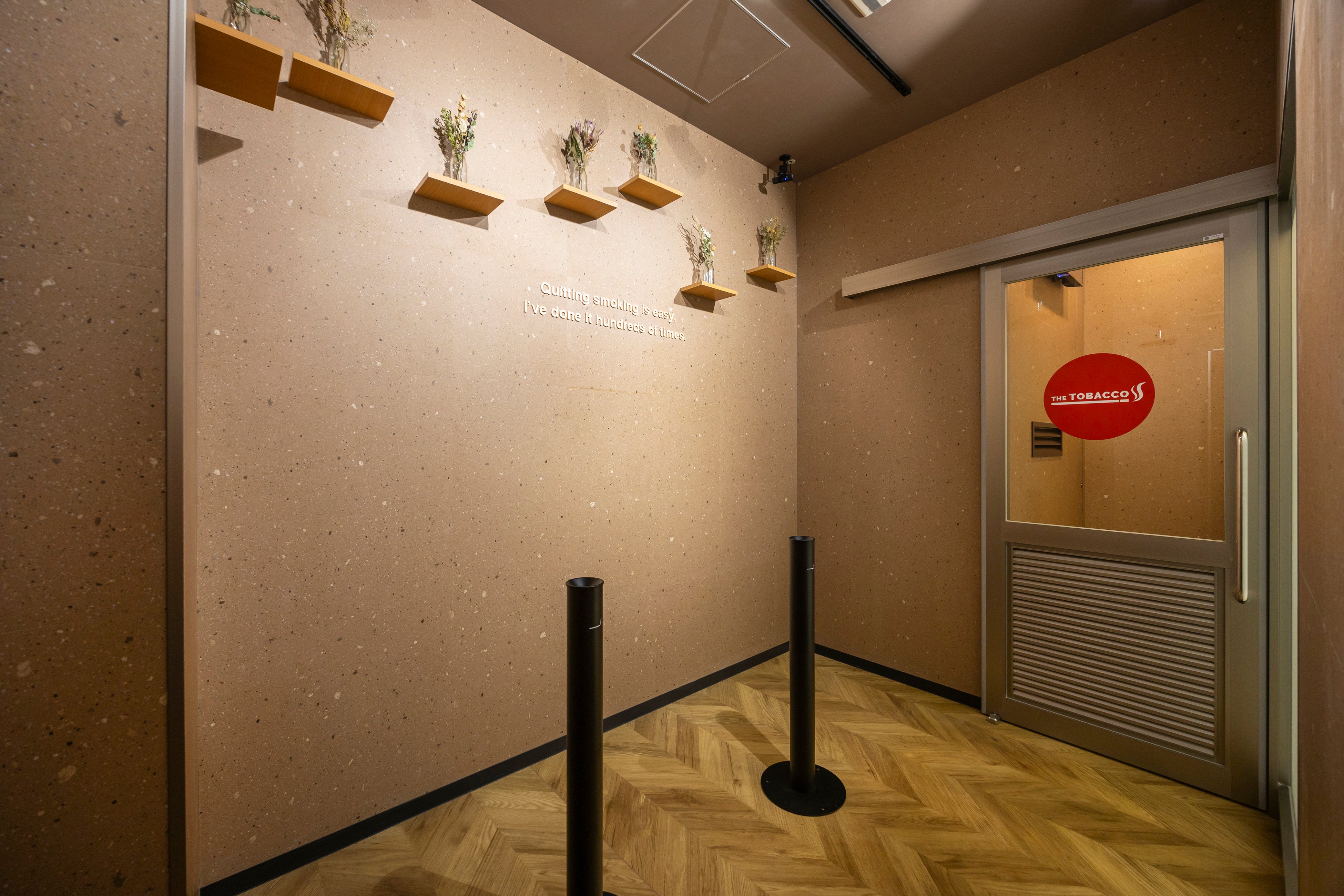 無機質になりがちな喫煙空間に、小さな物語とやわらかな彩りを重ねました。ガラス越しに透ける光や、素材のささやかな表情が、空間に静かな温度を与えます。