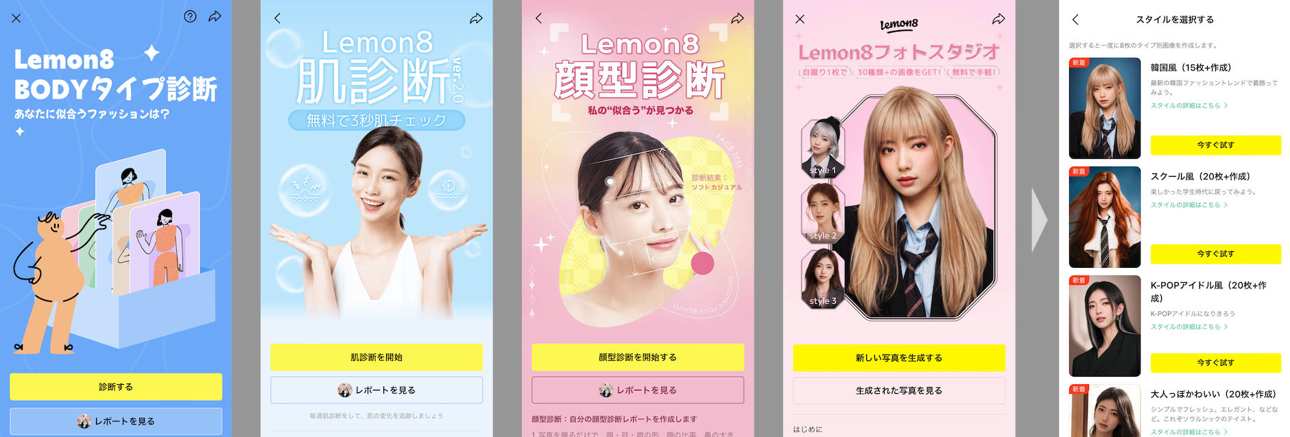 さらに投稿以外に、Lemon8ユーザーは無料で顔型診断、肌診断、BODYタイプ診断などの機能を利用できます。診断を通じて自分の顔型や体型を知り、最新の美容情報やコツを簡単にキャッチできます。新たにリリースした「Lemon8フォトスタジオ」機能では、自撮り画像1枚でさまざまな機械学習によりフォトを生成し、保存して友達と共有、または投稿するなど、常に新しい自分と出会えます。
