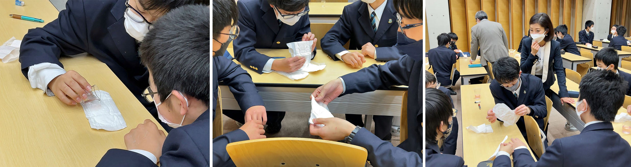 男子生徒たちは、物珍しい様子でナプキンやタンポンを手に取りながらも、吸水実験を行う場面では、真剣な眼差しで学ぶ姿が見られました。