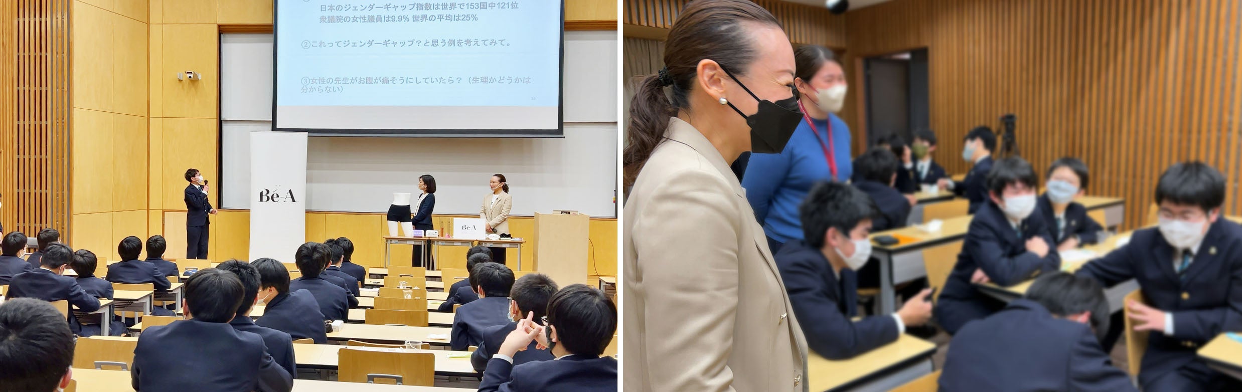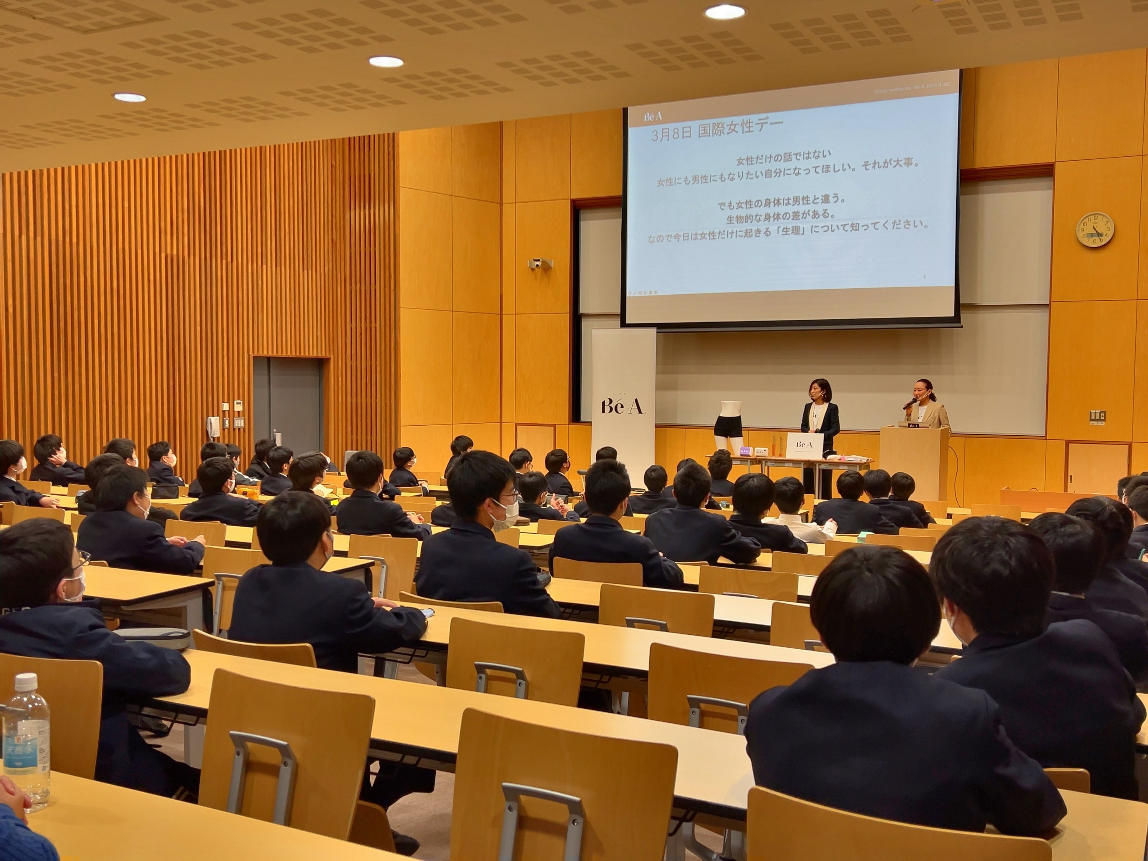 Be-A Japan CEO髙橋と、商品開発責任者CPO中村が登壇し、生理の基礎知識をお伝えするとともに、翌週に控える3月8日 の国際女性デーにちなみ、男子中学生と考える「国際女性デーとは」についてディスカッションを行いました。