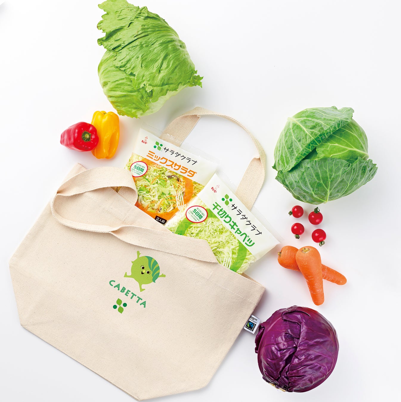 本キャンペーンでは、サラダクラブのパッケージサラダを購入し応募いただくと、抽選で合計500名様に『「ヤサイな仲間たち」のキャベッタ フェアトレード※コットントートバッグ』または『サラダのトッピング4種セット』をプレゼントします。
