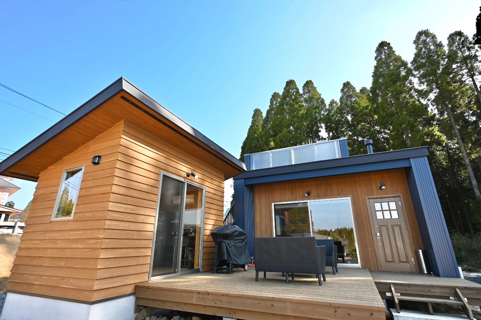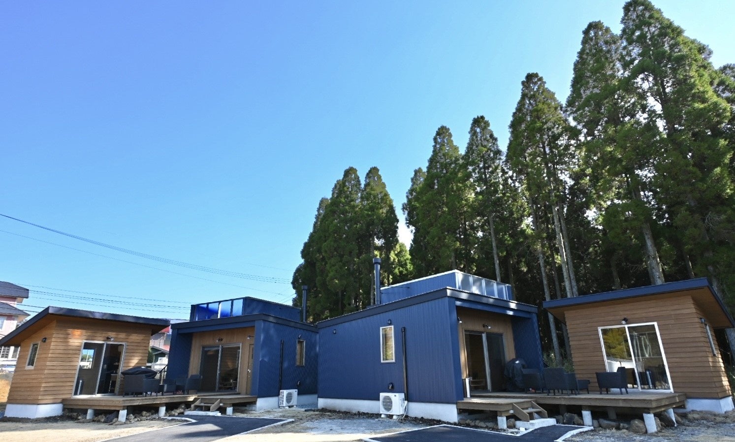 ログハウスのBESSの法人部門が、熊本県阿蘇市のコスギリゾートに、コテージタイプの宿泊棟2棟を竣工。別棟とした食堂棟、宿泊棟には薪ストーブや屋上の展望デッキを配し、グランピングの楽しさを演出します。