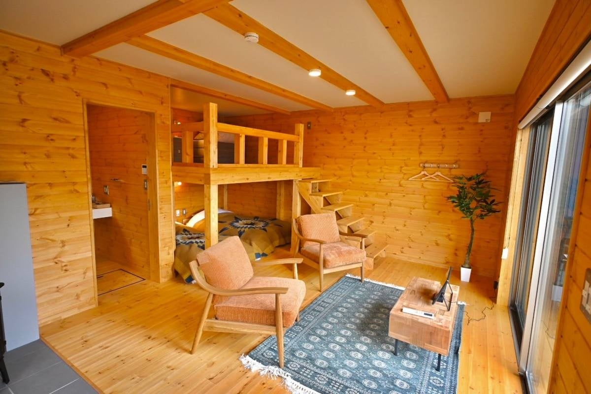 宿泊棟の室内は木に囲まれた空間。屋上には展望デッキがあり、リビングには炎を眺めて楽しめる薪ストーブ、宿泊棟にはユニークな櫓(やぐら)型のベッドを配するなど、グランピングの楽しみ方が広がる仕様となっています。BESSはログハウスを中心に多数の別荘建築を行ってきており、天然木をふんだんに使った/Cottageで、非日常感たっぷりの楽しい時間を設計しました。