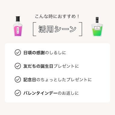 お出かけシーンだけでなく、家の中などのプライベート空間で香水を楽しむ人が増えている中、ちょっとしたお祝いや日頃の感謝の気持ちを伝える際、パートナーや友人に香水を贈りたいというニーズが高まっています。