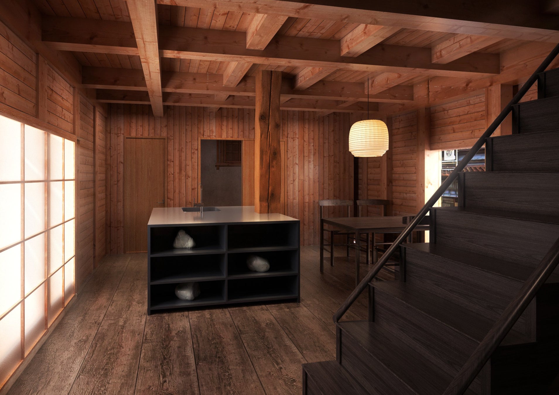趣の異なる3つの客室は、いずれも古民家の力強い骨組みを活かした広々とした造り。館内には九谷焼の名窯「錦山窯」の作品に触れられるギャラリーを併設し、安宅の歴史を静かに伝えます。共用ラウンジでは、安宅の空気を感じながらフリードリンクをお楽しみいただけます。