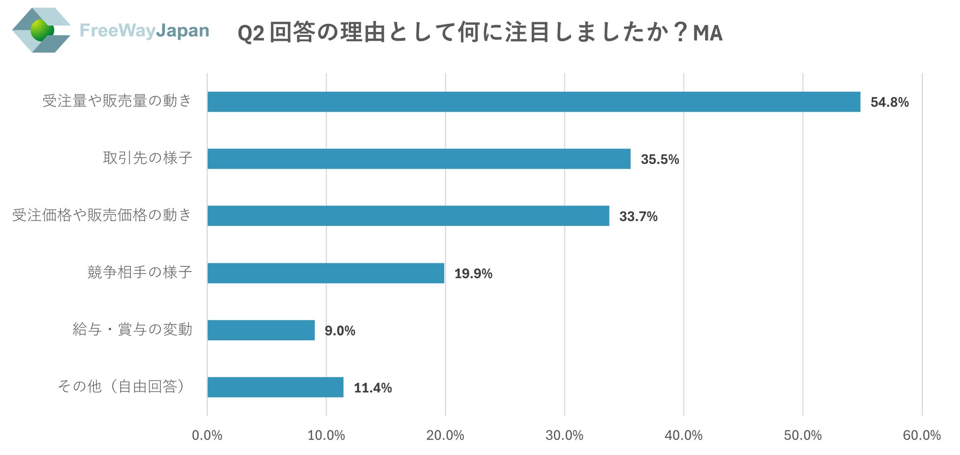 上記で「悪くなっている」「やや悪くなっている」と答えた方に、回答の理由として何に注目したか聞いたところ、「受注量や販売量の動き」が54.8%、「取引先の様子」が35.5%、「受注価格や販売価格の動き」が33.7%、「競争相手の様子」が19.9%、「給与・賞与の変動」が9.0%、その他が11.4%という結果だった。