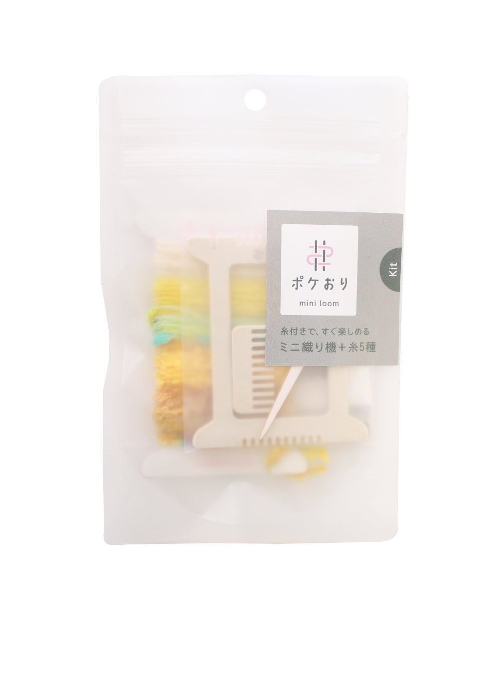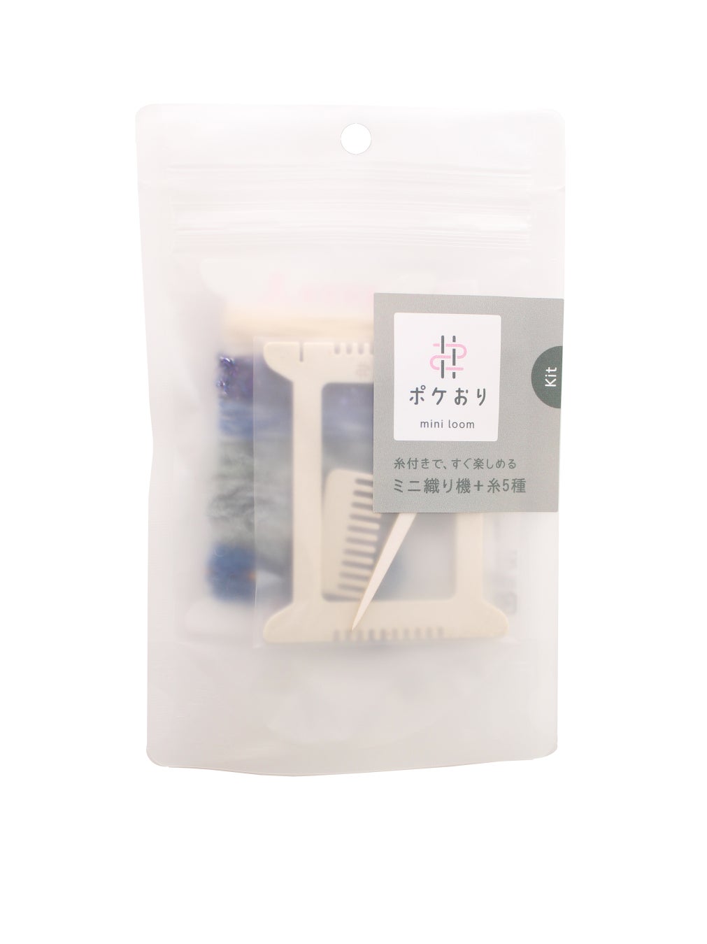 「ポケおり」は、大きさわずか幅約6.4cm×高さ約7.5cmのポケットサイズのミニ織り機です。「フレーム」「針」と織りを整える「くし」の3点セット、糸さえあれば、いつでもどこでも楽しめます。