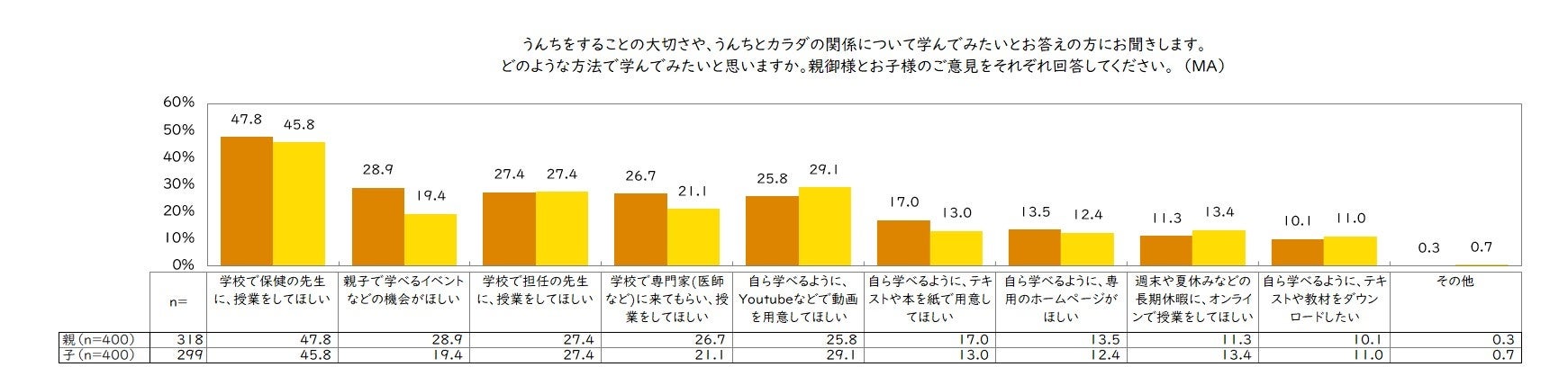 親子にわたってうんちに関する教育が不十分という状況の中、うんちをすることの大切さや、うんちと身体の関係について学べる機会があれば学んでみたいと答えた答えた親子のうち、どのような方法で学んでみたいかという質問に対し、親も子も「学校で保健の先生に、授業をしてほしい」と答えた割合が最も多く、約半数にのぼりました。グラフ1で「うんち(排便)に行ったことが友達にばれるのが心配」と答えた子どもが45.0%であることからも、学校で一斉にうんちに関する教育を受けることで、うんちをすることの大切さを子どもたちの間で共通認識として持ち、うんち(排便)は恥ずかしいことではないという意識に変えていくことが効果的であるといえます。