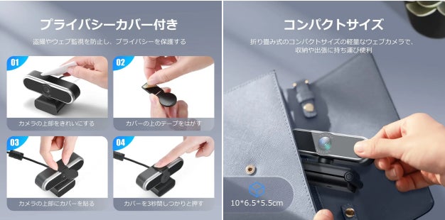 ライバシーカバーを搭載しており、非使用時にカメラを無効化することで、切り忘れによるプライバシーの流出や、遠隔ハッキング等による盗撮を防ぐことが出来ます。折り畳み式のデザインにより、外出先へも気軽に持ち運ぶことが可能です。筐体自体が非常に小型のため、収納や外出先への持ち出しに便利です。