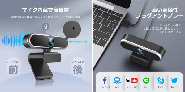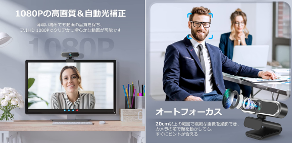 カメラの前で体や顔を移動しても、常に自動でピントを合わせてくれます。また、暗い環境でオンライン通話を行う際にも、ホワイトバランスを自動的に修正することで、十分な光源が見つからない場合でも見やすい映像を届けることが出来ます。