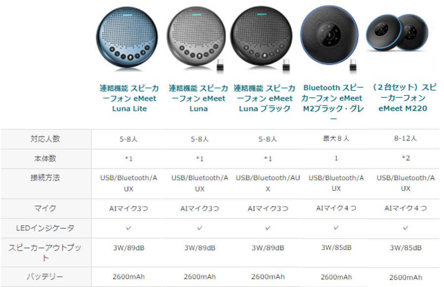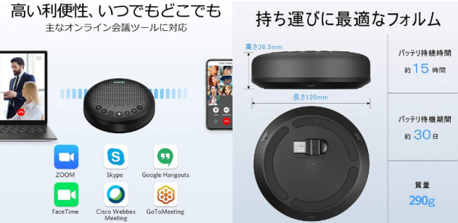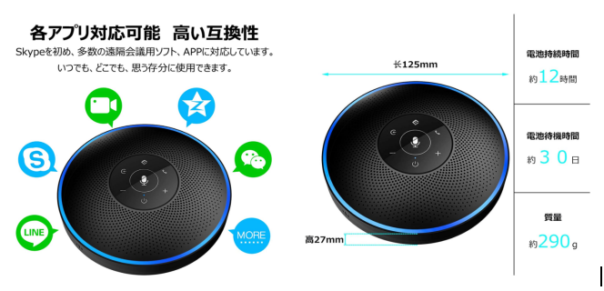 USBだけではなくBluetooth接続も対応でき、Audio IN/OUTなどの多様なインターフェースを備え、デスクトップからモバイルまであらゆるデバイスからご参加できるような会議用スピーカーフォンです。Skype/ZOOM/Facetime通話アプリも対応でき、使い勝手が良いです。