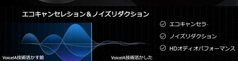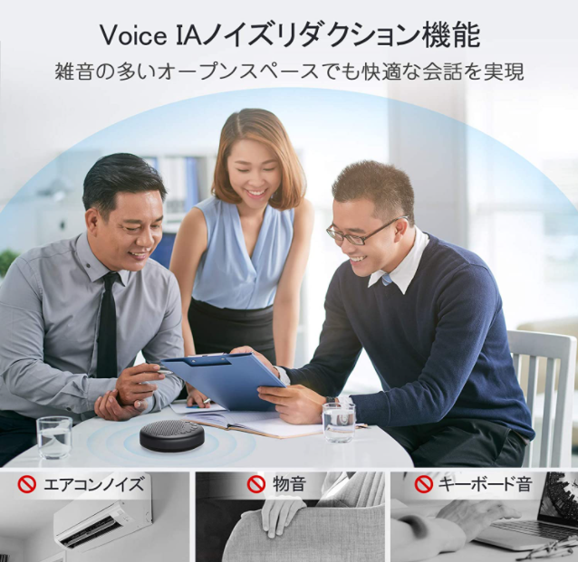 eMeet独自の音声信号処理技術を活かした "Voice IAモード" により、周囲の雑音、ノイズなどを抑制し、発言者の声を明瞭に届けることが出来ます。さらに、エコーキャンセリング機能およびノイズキャンセリング機能の搭載により、快適な双方向会話を可能にします。