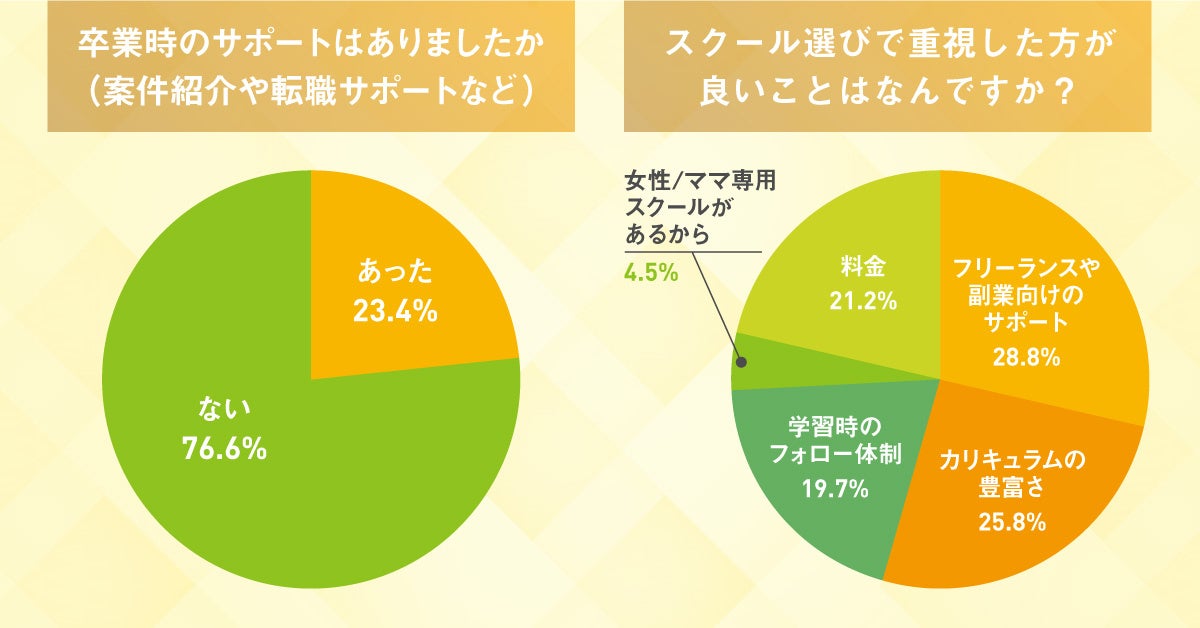 収入の変化がなかった方も4割いたのですが、しっかりと収入を得ることができるには案件紹介や転職サポートが受けれることが重要になってきそうですが、実際のサポート状況やスクール選びで重視した方が良いと思うことを見てみましょう。