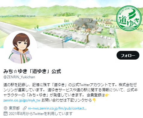 「道ゆき」公式キャラクターの“みち☆ゆき”ちゃんが、「道ゆき」サービスや道の駅に関する情報を公式Twitterで定期的に呟いています。