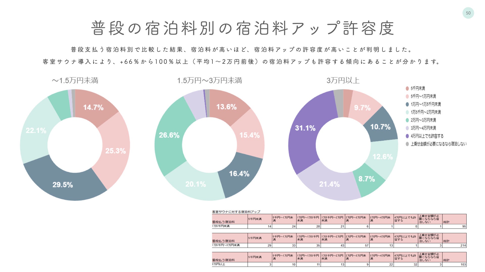 単価1.5万円から3.0万円未満の顧客層: 1万円から2万円程度の宿泊料アップを許容する傾向。