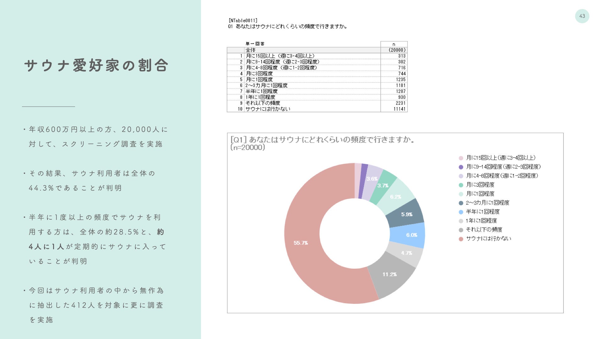 今回の調査では、まず20,000人を対象にサウナ利用状況のスクリーニング調査を実施しました。その結果、回答者の半数近い水準である44.3%が定期的にサウナを利用していることが明らかになりました。さらに、28.5%が半年に一度以上の頻度でサウナを利用しており、およそ4人に1人が日常生活の中に積極的にサウナを取り入れていることがわかります。