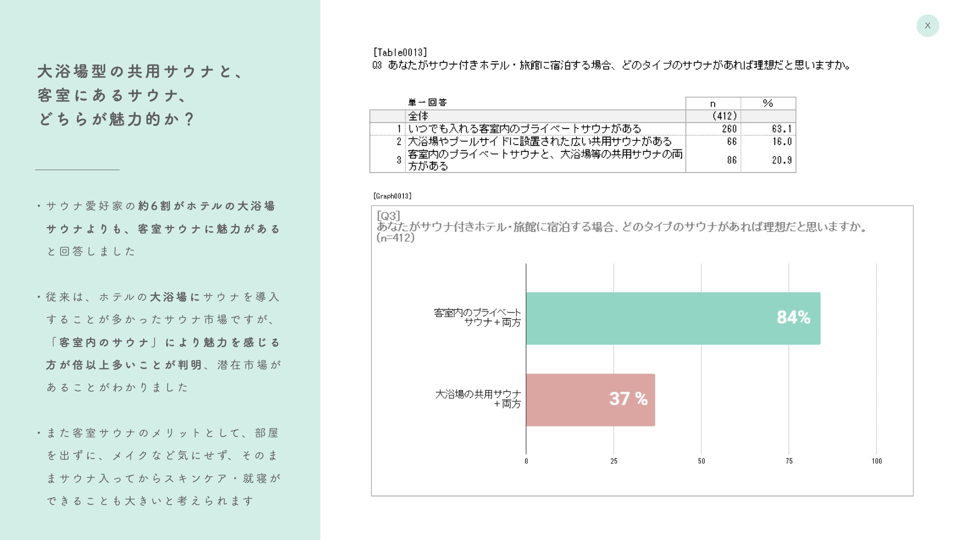 また、その中でも、大浴場型の共用サウナよりも客室にサウナがあることにより大きな魅力を感じる人が倍以上いるという傾向も明らかになりました。