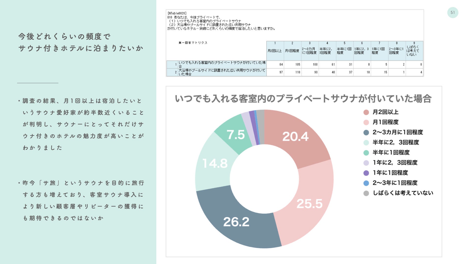 このデータからも、サウナ愛好家の8割以上が、客室サウナに一定の魅力を感じていることがわかります。