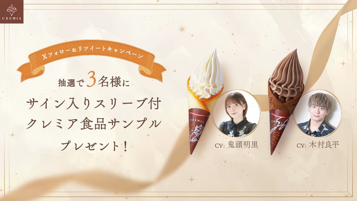 ◆クレミア公式Xアカウントをフォロー、対象のツイートをリツイートすることで、「出演声優のサイン入りスリーブ付クレミア食品サンプル」が当たるチャンス!(2個セット3名様)