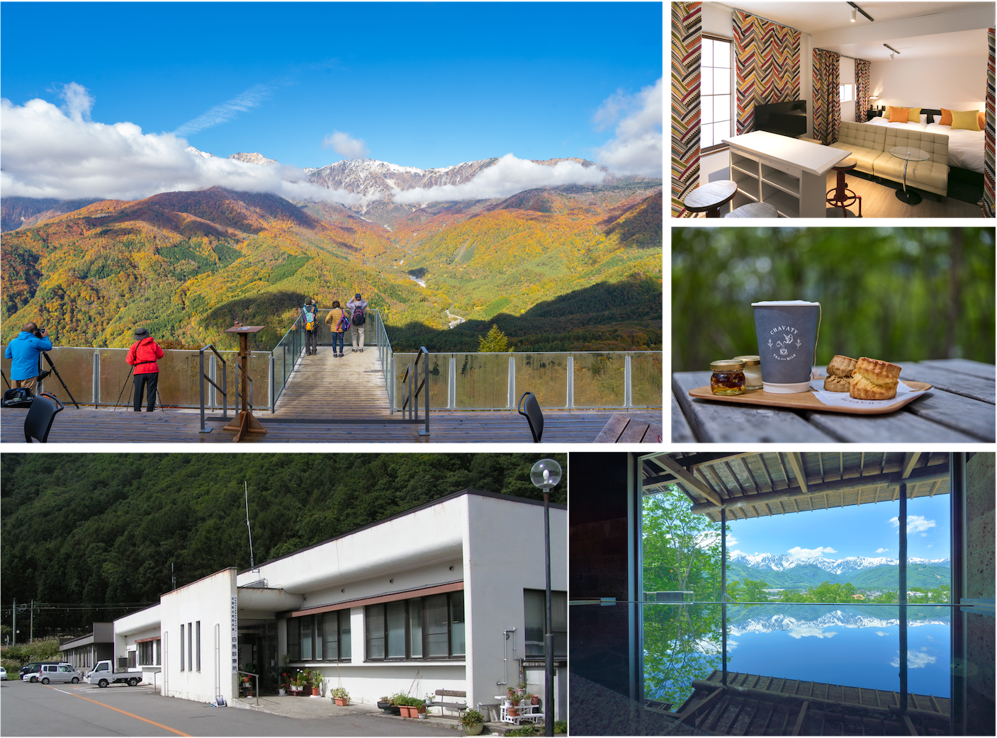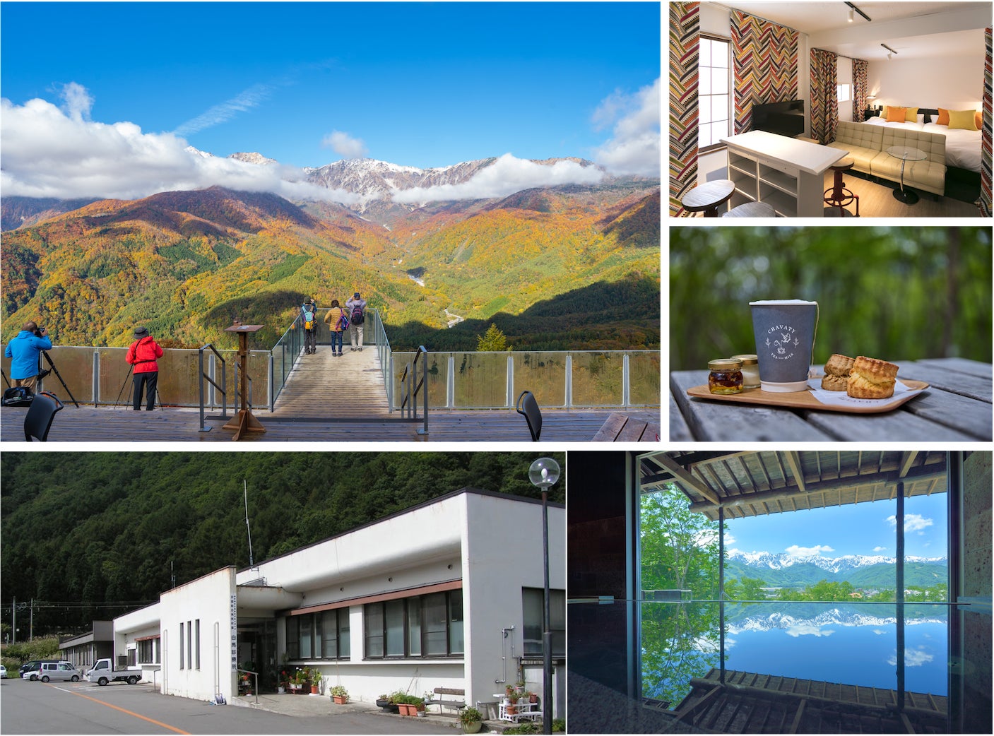 アクセス:東京から約3時間、名古屋から約3時間30分、関西から約4時間30分、最寄IC(長野IC、安曇野IC、糸魚川IC)から幅広道路で約1時間
