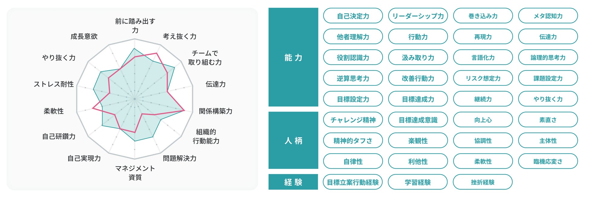 「自己実現力」、「自己研鑽力」、「柔軟性」、「ストレス耐性」、「やり抜く力」、「成長意欲」