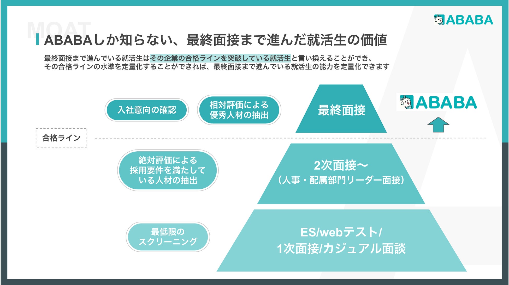 当社は既存サービスとして、最終面接まで進んだ実績を持つ就活生だけが企業からスカウトを受け取れるプラットフォーム『ABABA』を運用しています。