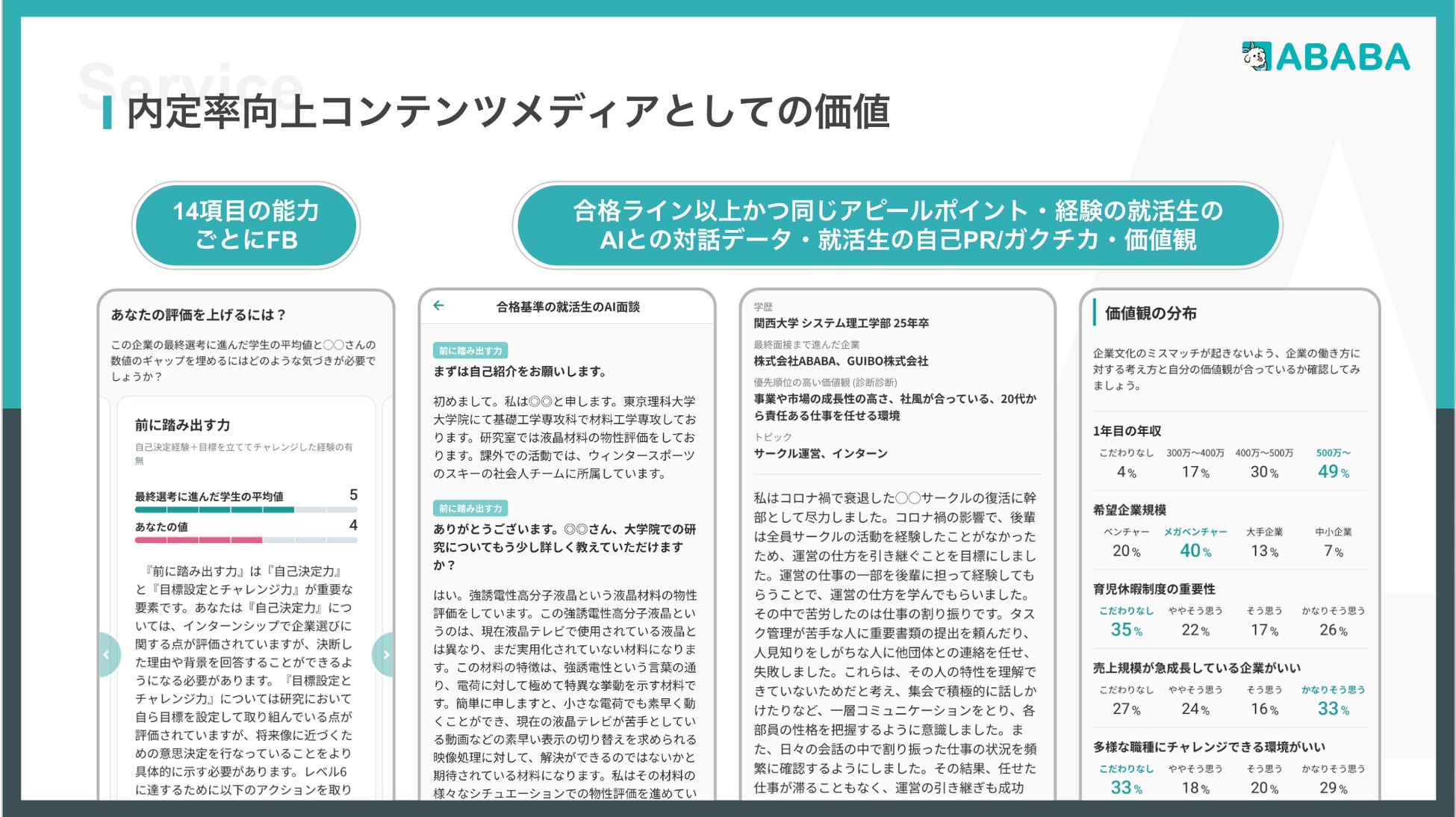 本サービスの提供により、既存サービス『ABABA』で対象としてきた就活後半期の学生に加え、就活前半・中盤期の学生に対しての就職活動支援を行って参ります。