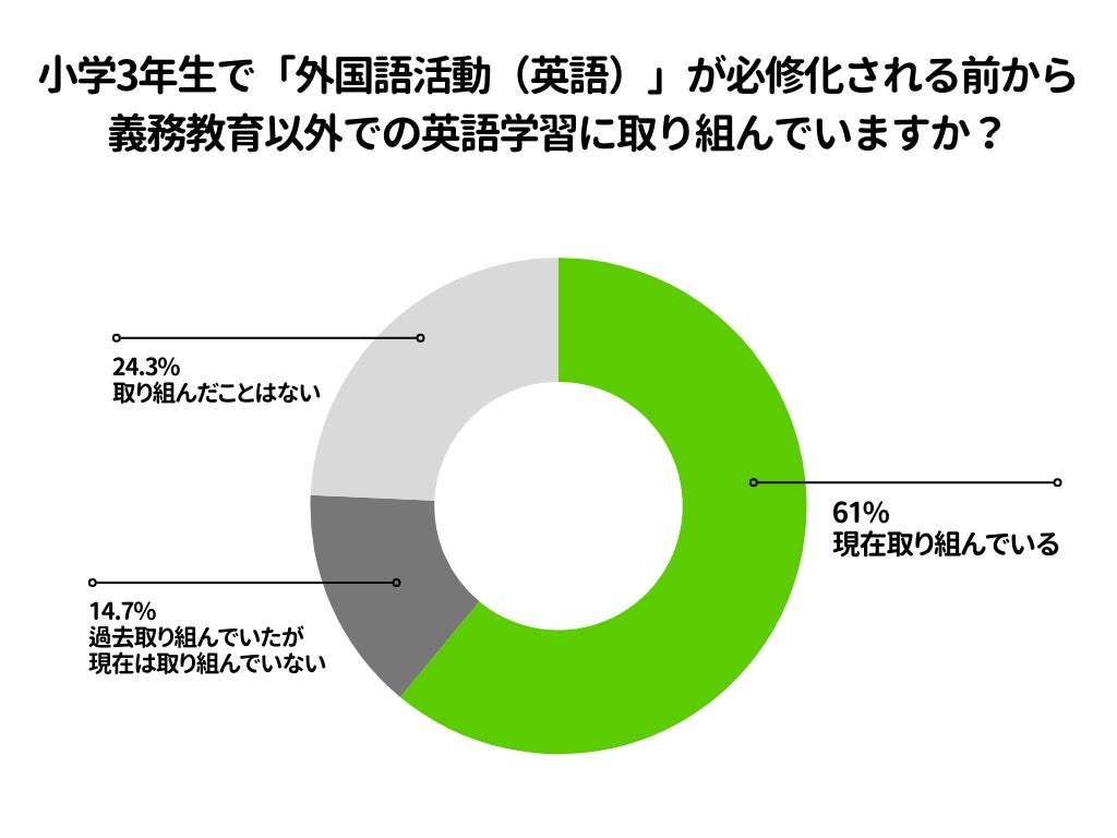 こうした不安からか、「外国語活動(英語)が必修化される前から、義務教育以外での英語学習に取り組んでいますか?」という質問では、61%が「現在取り組んでいる」と回答。過去に取り組んでいた人も含めると7割以上(75.7%)が英語学習に取り組んだ経験があるという結果になりました。