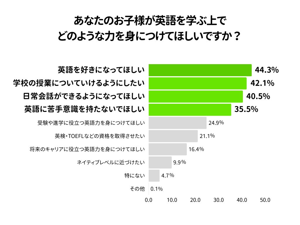 「あなたのお子様が英語を学ぶ上で、どのような力を身につけてほしいですか?(複数回答)」という質問をしたところ、「英語を好きになってほしい」が最も多く(44.3%)、ついで「学校の授業についていけるようにしたい(42.1%)」となりました。
