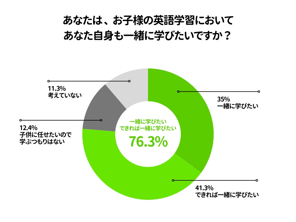 また、「お子様の英語学習において、あなた自身も一緒に学びたいですか?」という質問には、76.3%の親が「一緒に学びたい」「できれば一緒に学びたい」と回答しており、親子で英語を学べる環境へのニーズが高いことがわかりました。