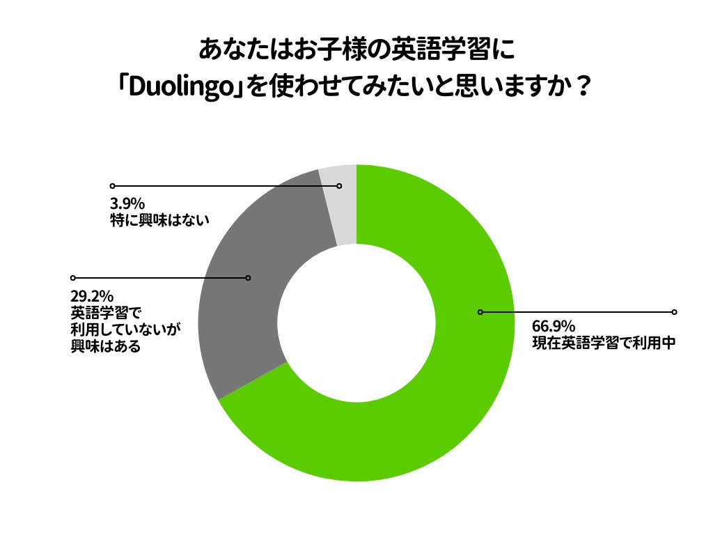 最後に、本調査では回答者全体に対し、「あなたはお子様の英語学習に『Duolingo』を使わせてみたいと思いますか?」と尋ねたところ、66.9%の親がすでにDuolingoを利用中であり、29.2%の親がDuolingoに興味を持っていると回答しました。