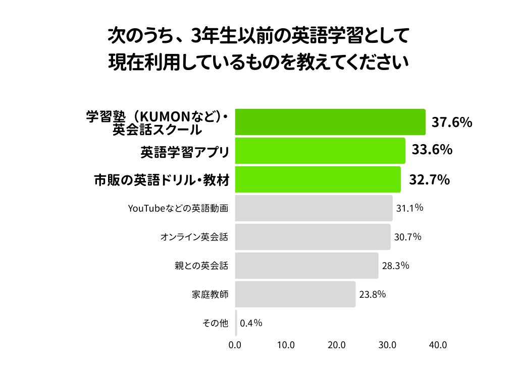 現在すでに英語学習に取り組んでいる子どもを持つ親に対して、学習方法を聞いたところ、最も人気なのが「学習塾(KUMONなど)・英会話スクール」で37.6%、ついで「英語学習アプリ」が33.6%、「市販の英語ドリル・教材」が32.7%となりました。
