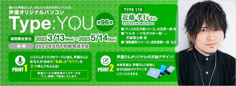 声優オリジナルパソコンに近藤孝行さんが登場!【Type:YOU -タイプユー-】第96弾は3月13日よりスマッシュコアで受注開始!