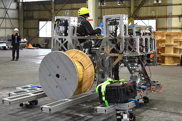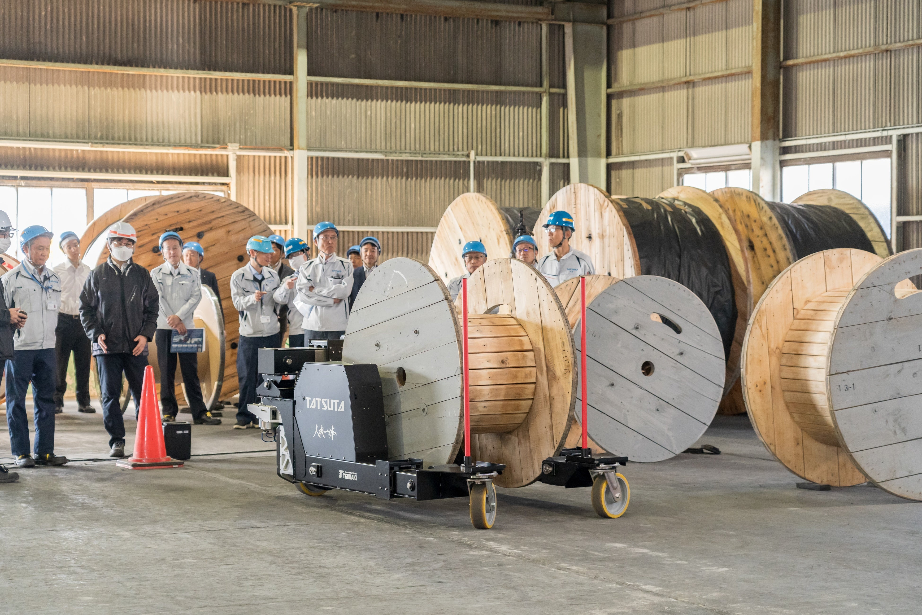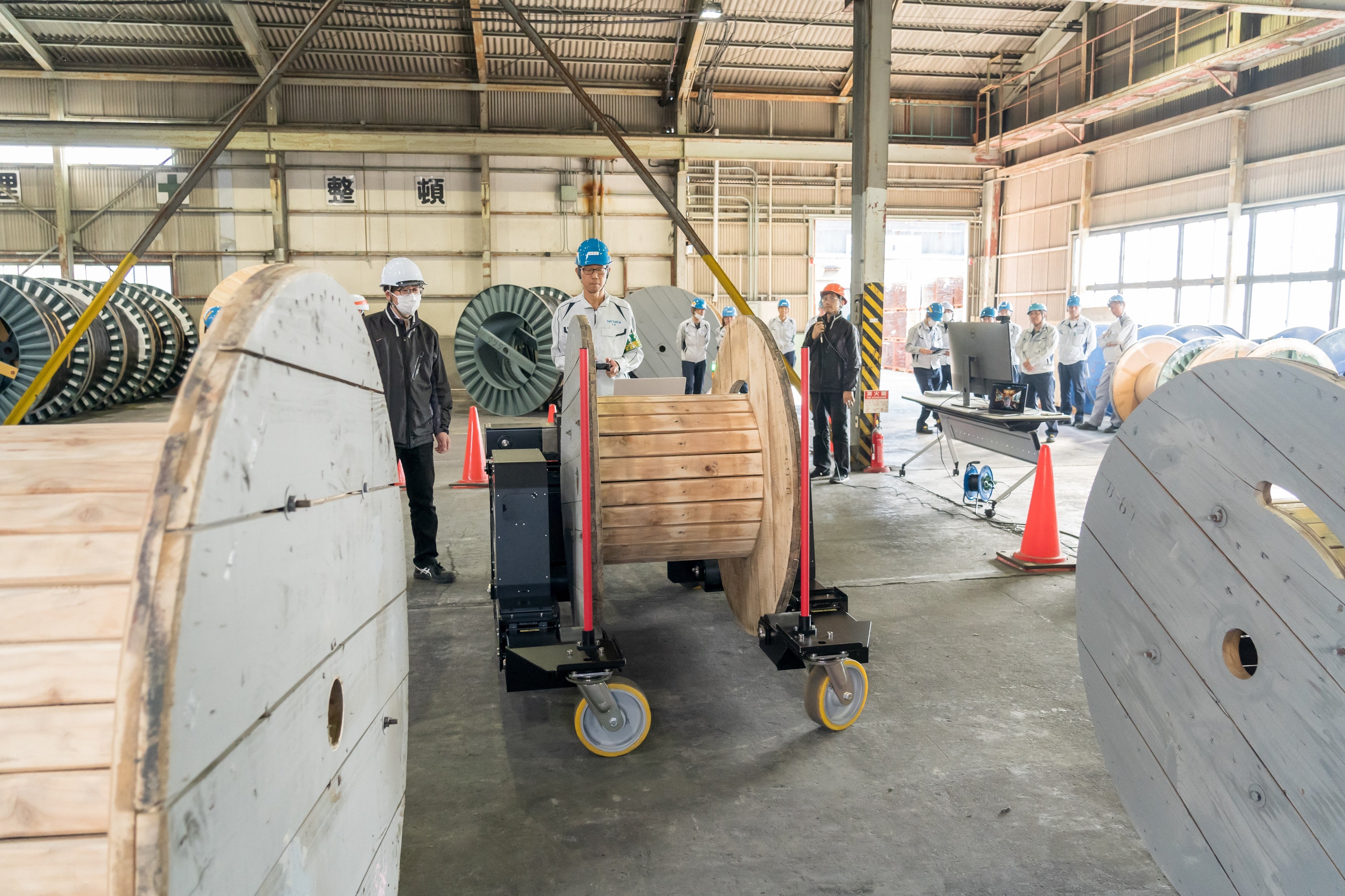 2023 年 03 月にタツタ電線大阪工場にて、同プラットフォーム最初の試作機「人機カート ver.1.0」による電線ドラムの搬送デモンストレーションを実施しました。