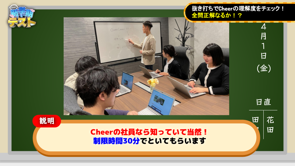 ベンチャー・成長企業のための就活サイトCheerCareer(チアキャリア)を運営している株式会社Cheer(本社:東京都新宿区、代表取締役:平塚ひかる)は、2022年4月1日(金)新宿本社にて、バラエティに飛んだ入社式を開催し、新たな仲間とコロナにも負けない絆を深めるコンテンツを実施しました。