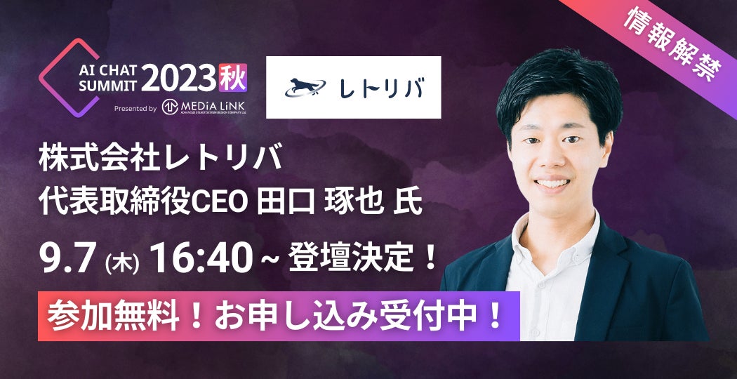 【レトリバ田口CEO、登壇決定!】大好評につき増枠!すべてのカスタマーサポートへ贈るAIチャットボットの祭典「AI CHAT SUMMIT 2023秋」9/7(木)9時30分~18時00分で開催!