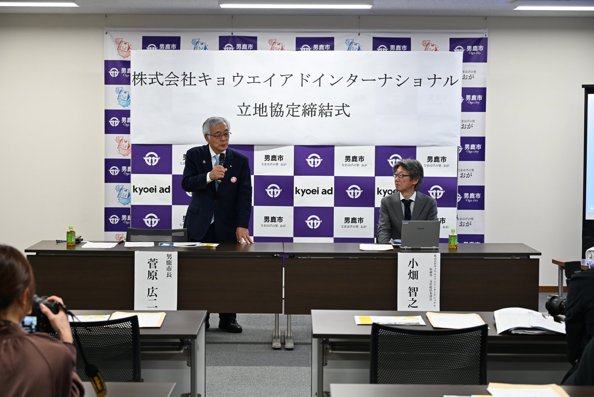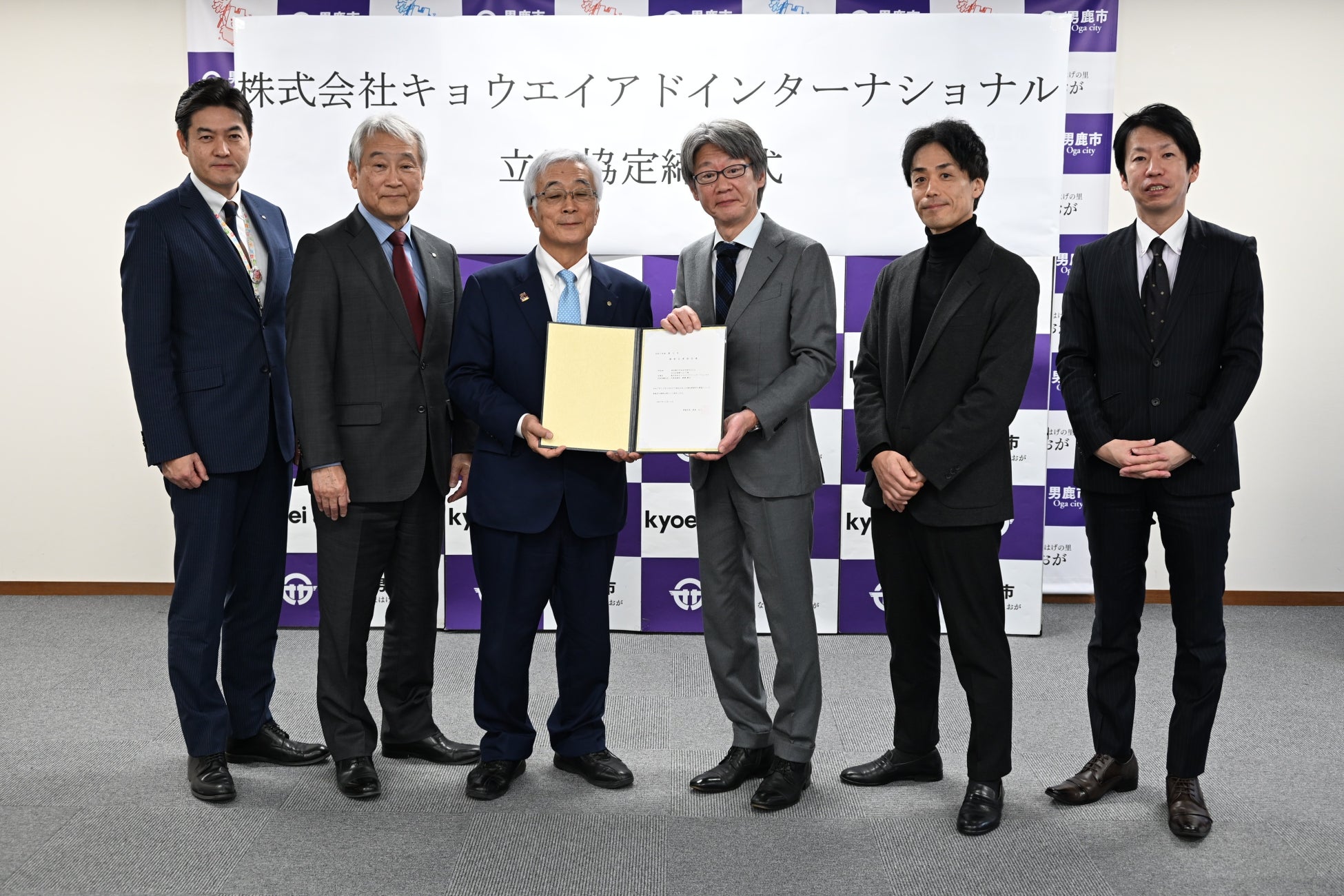 男鹿市のSNSなどで既報の通り、昨年12月19日、男鹿市役所の第一会議室にて執り行われた立地協定締結式には、当社より取締役本社営業本部長 片栁貴、取締役支社統括本部長 小畑智之、仙台支社長 豊田英司の3名が出席、誘致企業認定書の交付が行われました。続いてキョウエイアドの事業概要が紹介され、菅原広二 男鹿市長の挨拶では男鹿市のビジョンやキョウエイアドへの強い期待が表明されました。