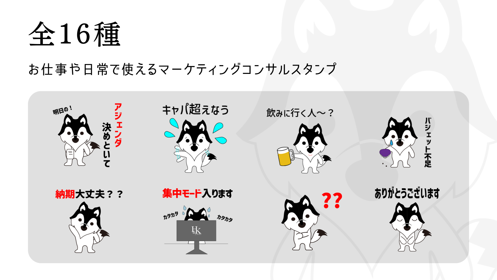 このたび、販売を開始した愛嬌あふれるH&KくんのLINEスタンプは、職場の同僚とのやりとりや日常でも使いやすい全16種をご用意しています。ぜひ、日々の業務など、生活の中でご活用ください。また、LINEスタンプ公開に合わせてオリジナルLINEスタンプ制作サービスも開始しております。自社のマーケティング・ブランディング事業で、LINEスタンプを活用したいと考えているお客様はお気軽にお問い合わせくださいませ。