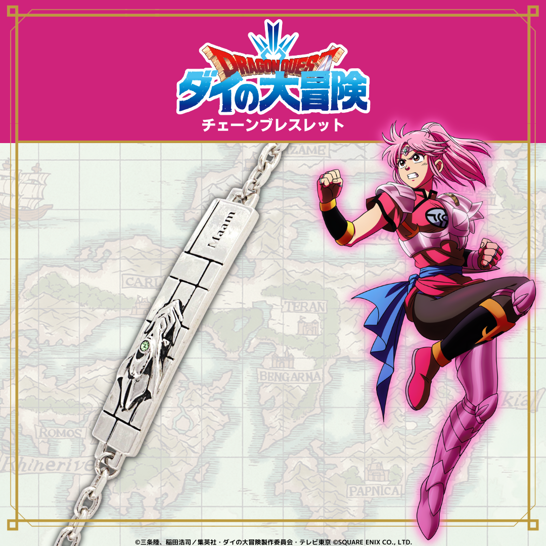TVアニメ『ドラゴンクエスト ダイの大冒険』より、マァムをイメージしたチェーンブレスレット。マァムの名前が刻印されたメタルプレートに、ロン・ベルクに制作してもらった魔甲拳を立体的にデザインしました。細部まで精巧に再現された甲手には緑のラインストーンが輝きます。アニメ完結記念のメモリアルアイテムとしてもおすすめです。