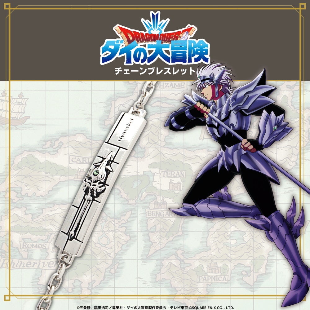 TVアニメ『ドラゴンクエスト ダイの大冒険』より、ヒュンケルをイメージしたチェーンブレスレット。ヒュンケルの名前が刻印されたメタルプレートに、ロン・ベルクに打ち直してもらった新生 鎧の魔槍を立体的にデザインしました。細部まで精巧に再現された槍には緑のラインストーンが輝きます。アニメ完結記念のメモリアルアイテムとしてもおすすめです。
