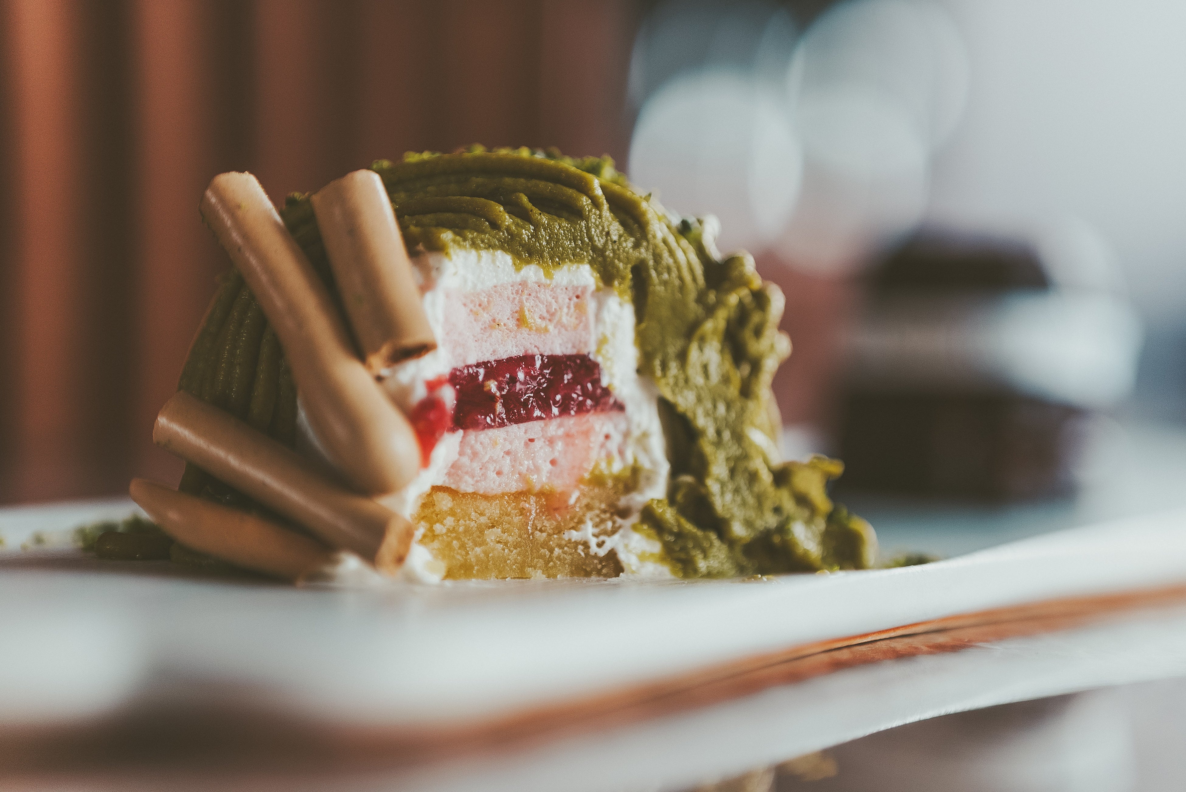 ”春の芽吹き”をコンセプトに、新緑と枝葉を表現したプレートは、アーモンドパウダーを混ぜた生地 (クレームダマンド) の上に桜のムースを重ね、スペイン産ピスタチオペーストを合わせた自家製モンブランクリームで包み込んだ一皿。春らしい桜の香りと濃厚なピスタチオの香ばしさに、桜のムースの間に重なる甘酸っぱい苺のコンフィチュールが軽やかな口当たりを演出し、飽きのこないまとまりのあるプレートに仕上がりました。