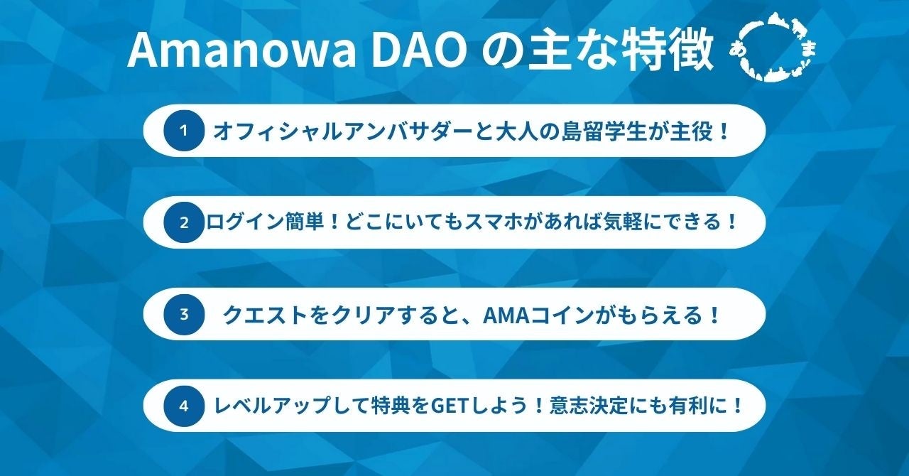 海士町(町長:大江 和彦)は、一般財団法人島前ふるさと魅力化財団(島根県隠岐島前)と連携し、海士町の滞在人口(主に大人の島留学生)と関係人口(主に海士町オフィシャルアンバサダー)が、現実とデジタルの両空間における「協働・共創」と「地域経営への参画」の推進に資する組織となることを目指し、分散型自律組織(以下Amanowa DAO)の運営を2024年11月18日より開始します。