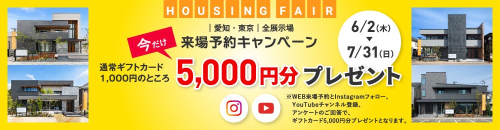 戸建住宅を中心とした住宅プラットフォーム事業を展開する株式会社アールプランナー(本社:名古屋市東区、代表取締役社長:梢 政樹、以下「当社」)は、事前にWEB来場予約の上、当社の住宅展示場へ初めてご来場され、SNSのご登録とアンケートにご協力いただいたお客様に、ギフトカード5,000円分をプレゼントするキャンペーンを開始しました。