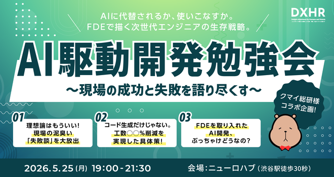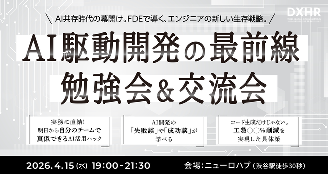 DXHR株式会社(本社:東京都渋谷区、代表取締役:前田 一成、以下 DXHR)は、2026年4月15日(水)、当社が運営するコワーキングスペース「NeuroHub(ニューロハブ)」にて、エンジニア向けイベント「AI駆動開発勉強会&交流会」を開催いたしました。