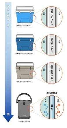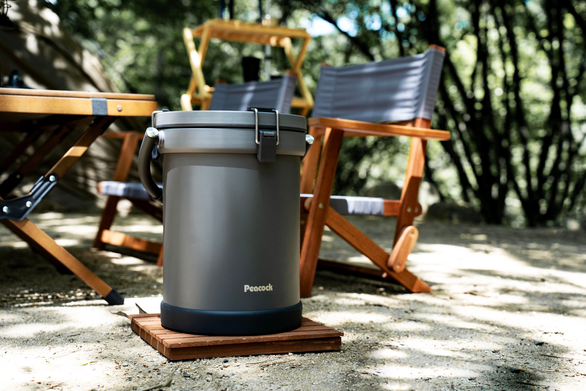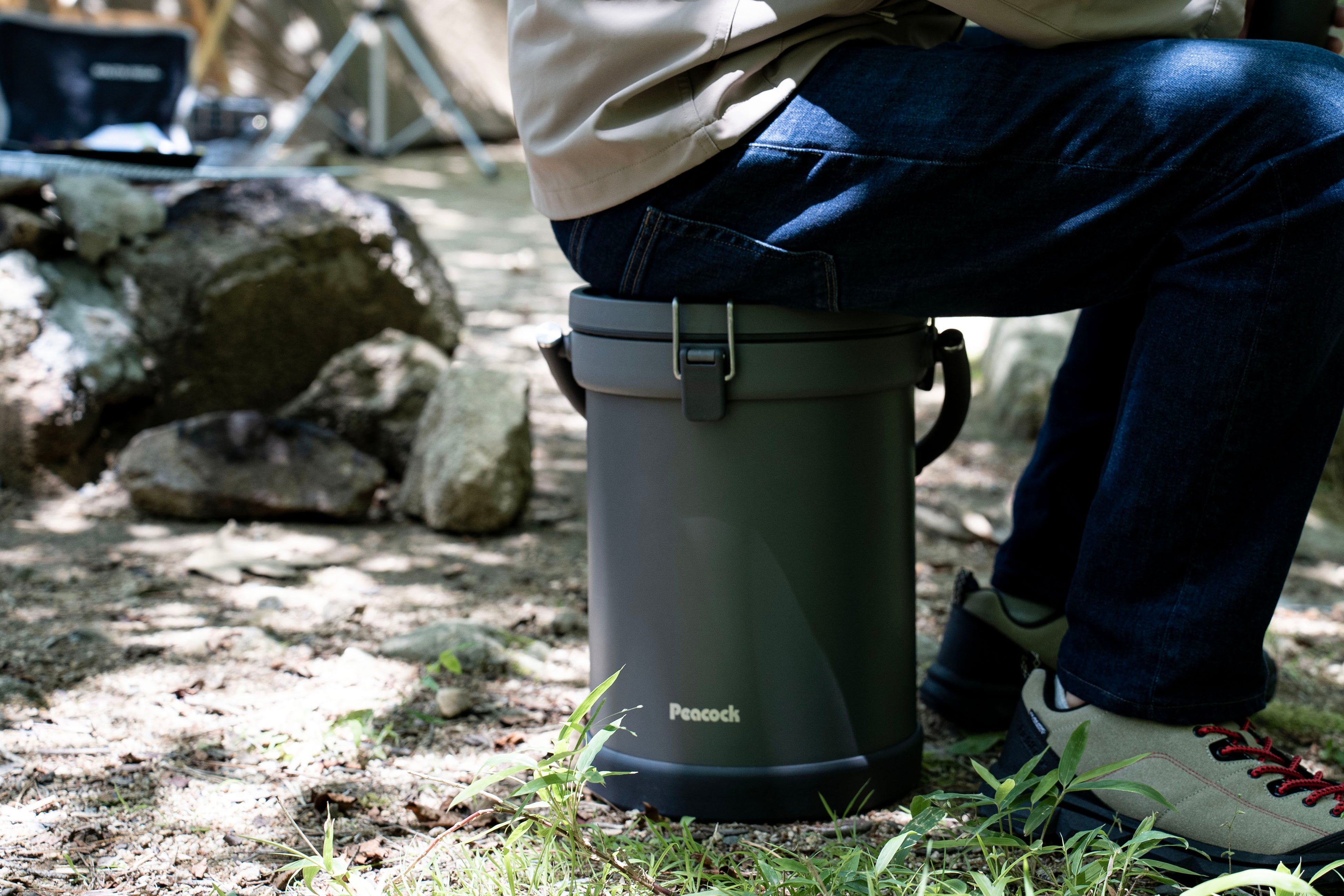 アウトドアやスポーツなど、あらゆるシーンで活躍する高い機能性を持ったアイテムを開発したいという思いから、創業74年の老舗魔法瓶メーカーであるピーコック魔法瓶は魔法瓶構造を採用した”本気のクーラーボックス”を開発しました。『クーラーバケット IGN-100』は、圧倒的な断熱性を誇る魔法瓶構造を採用し、本体の「真空の壁」が内気と外気をシャットアウトします。気体による熱伝導率が限りなくゼロに近いため、約7日間も氷が残る最強クラスの保冷効果を発揮します。さらに、様々なシーンで快適にお使いいただけるよう機能性にもこだわり、特大サイズのアイスペールや食材の保冷としてだけでなく、椅子やミニテーブルとしても活用いただけます。また、止水性の高いパッキンや傷つき防止の底カバー、ふたの開けにくさを解消する調圧弁も採用しています。アウトドアやスポーツ、屋外イベントなど、これからの季節で活躍するアイテムです。