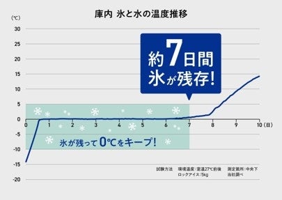 27℃前後の環境下で、5㎏の氷をクーラーバケットに入れて庫内の温度を観測したところ、約7日間も庫内の温度を0℃でキープし、氷が残るという結果が得られました。また、一般的な発泡ウレタン構造のクーラーボックスに比べ、本体が「真空断熱」構造のクーラーバケットは、65℃という環境下でも、他社製品の約2倍もの氷が庫内に残るという結果も残しています。